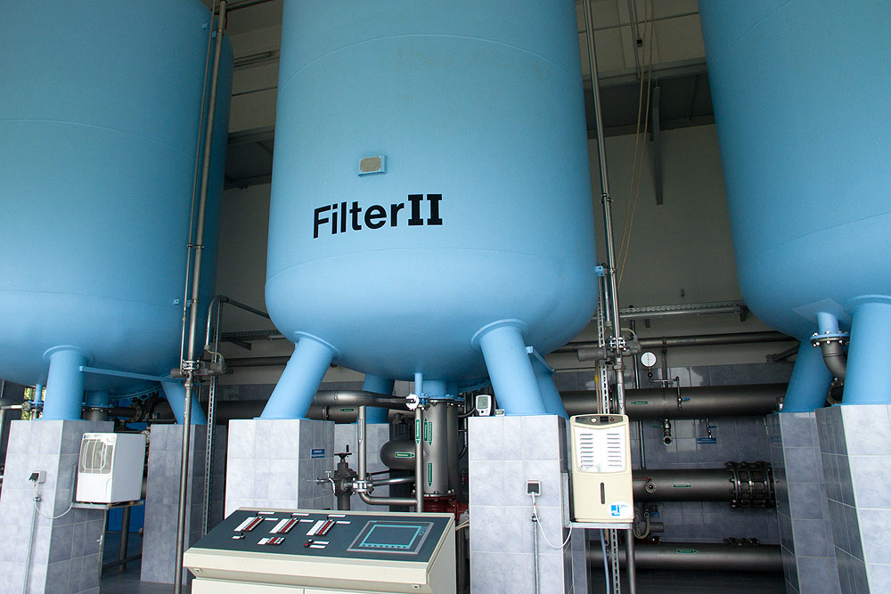 Filterhalle mit Behältern zur Wasserfilterung, Vergrößerung durch KlickFilterhalle mit Behältern und Rohren zur Wasserfilterung, Vergrößerung durch Klick